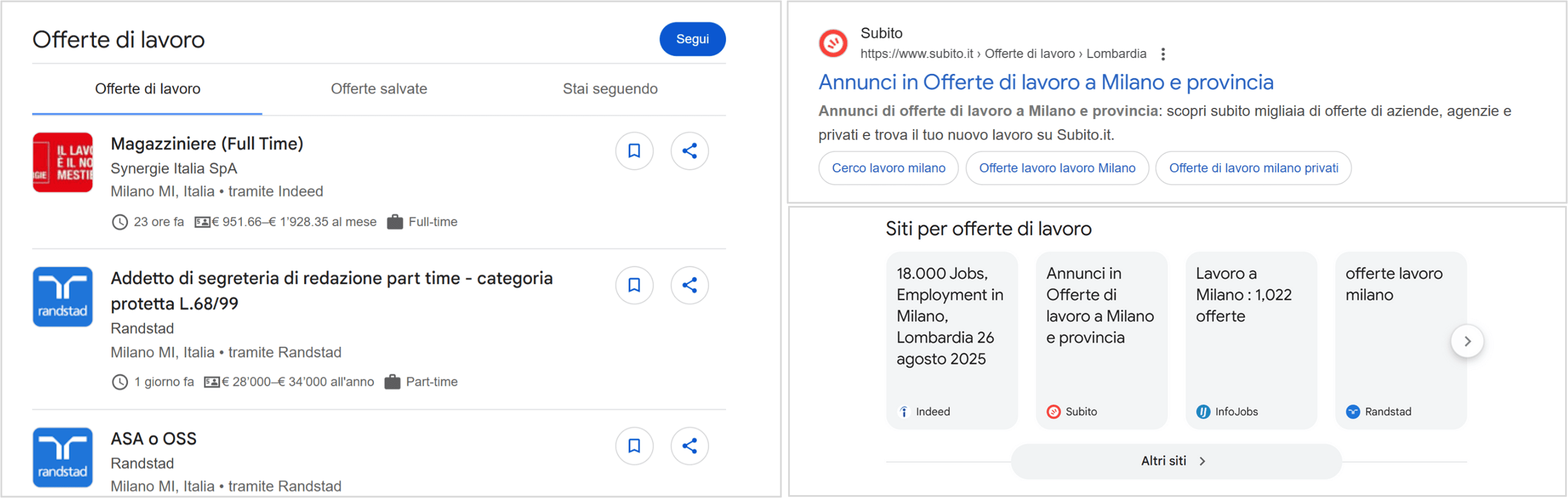 Il primo passo è avere listati chiari: il candidato cerca “offerte di lavoro a Milano”, ma anche “offerte part-time” o “offerte di lavoro a Torino come magazziniere”.